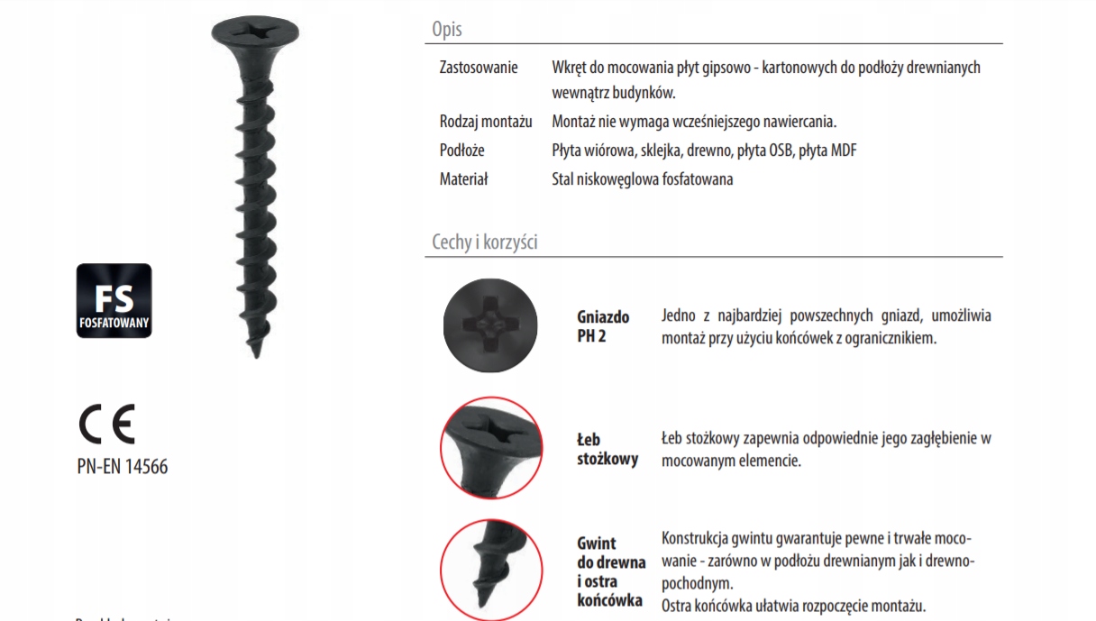 Wkręty do mocowania płyt G-K do podłoży drewnianych wewnątrz budynków. Wykonane ze stali, powłoka fosfatowana, która chroni wkręty przed korozją. Typ wgłębienia PH2
